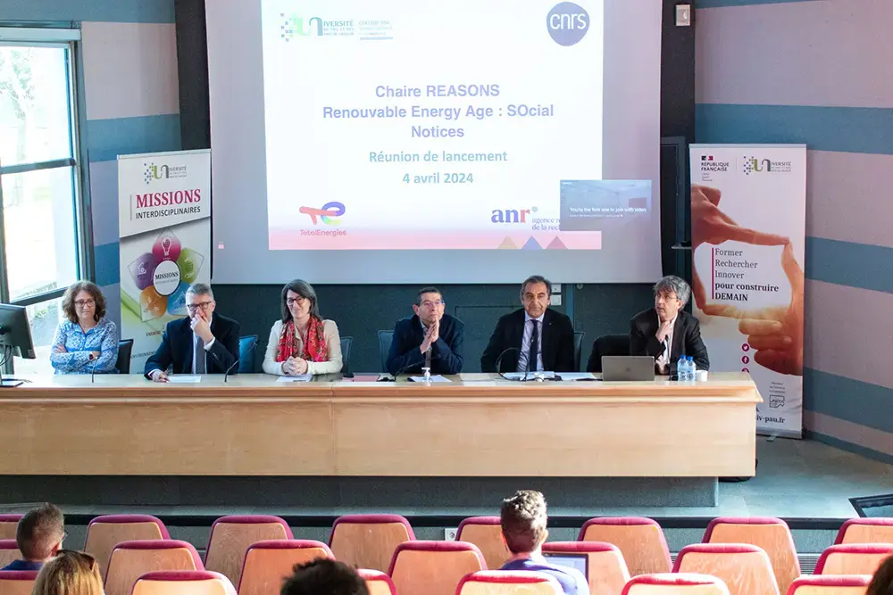 Lancement de la chaire Reasons à l'UPPA avec de gauche à droite : Christine Bouisset, directrice adjointe du laboratoire TREE (CNRS/UPPA), Ilias Iliopoulos, président du comité Chaires Industrielles (ANR), Marie-France Bénassy, responsable du Programme de R&D Sécurité Environnement et Développement Durable (TotalEnergies), Christophe Derail, vice-président Partenariat et Innovation (UPPA), représentant le président Laurent Bordes, Younis Hermès, délégué régional Aquitaine (CNRS), Xavier Arnauld de Sartre, directeur du laboratoire TREE (CNRS/UPPA).